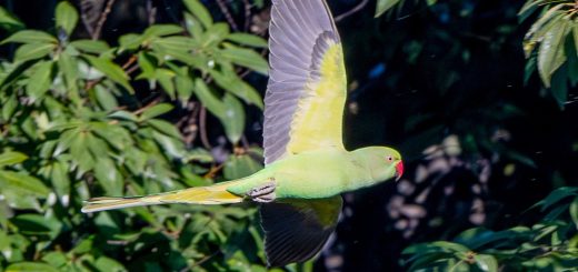 近くの森にキビタキを探しに行ったが全然見つからず、さまよっていたら、ワカケホンセイインコを見つけた。野生化したインコのようだが、森の中で何を食べているのか興味がわき撮影してみた。